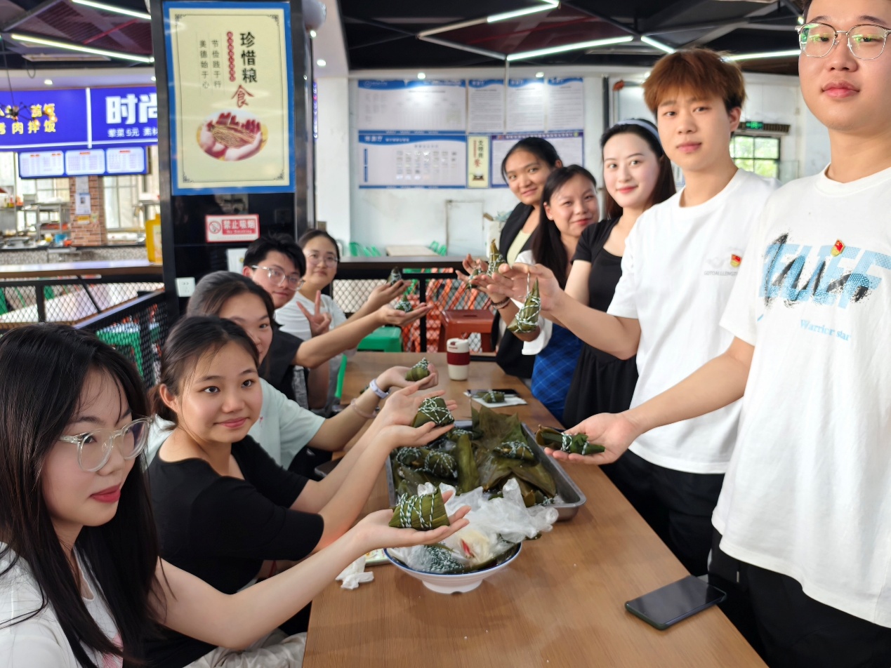 活动现场,糯米、红豆、粽叶、棉线等材料整齐摆放,洋溢着浓浓的节日氛围。同学们分组学习包粽子技巧,有的手法娴熟,有的别出心裁,现场欢声笑语不断,各式各样的粽子逐渐堆满托盘。粽叶的清香与党员们的热情交织在一起,勾勒出一幅温馨和谐的图景。