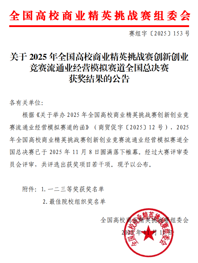2025年11月,由中国国际贸易促进委员会商业行业委员会、中国国际商会商业行业商会、中国商业经济学会共同主办的2025年全国高校商业精英挑战赛创新创业竞赛“流通业模拟赛道”全国总决赛圆满落幕。公司yl23455永利集团选派的一支代表队凭借出色的综合表现,历经作品提交、视频陈述与线上实时答辩等多个环节的激烈角逐,最终脱颖而出,荣获全国一等奖,展现出扎实的专业素养与卓越的创新能力。