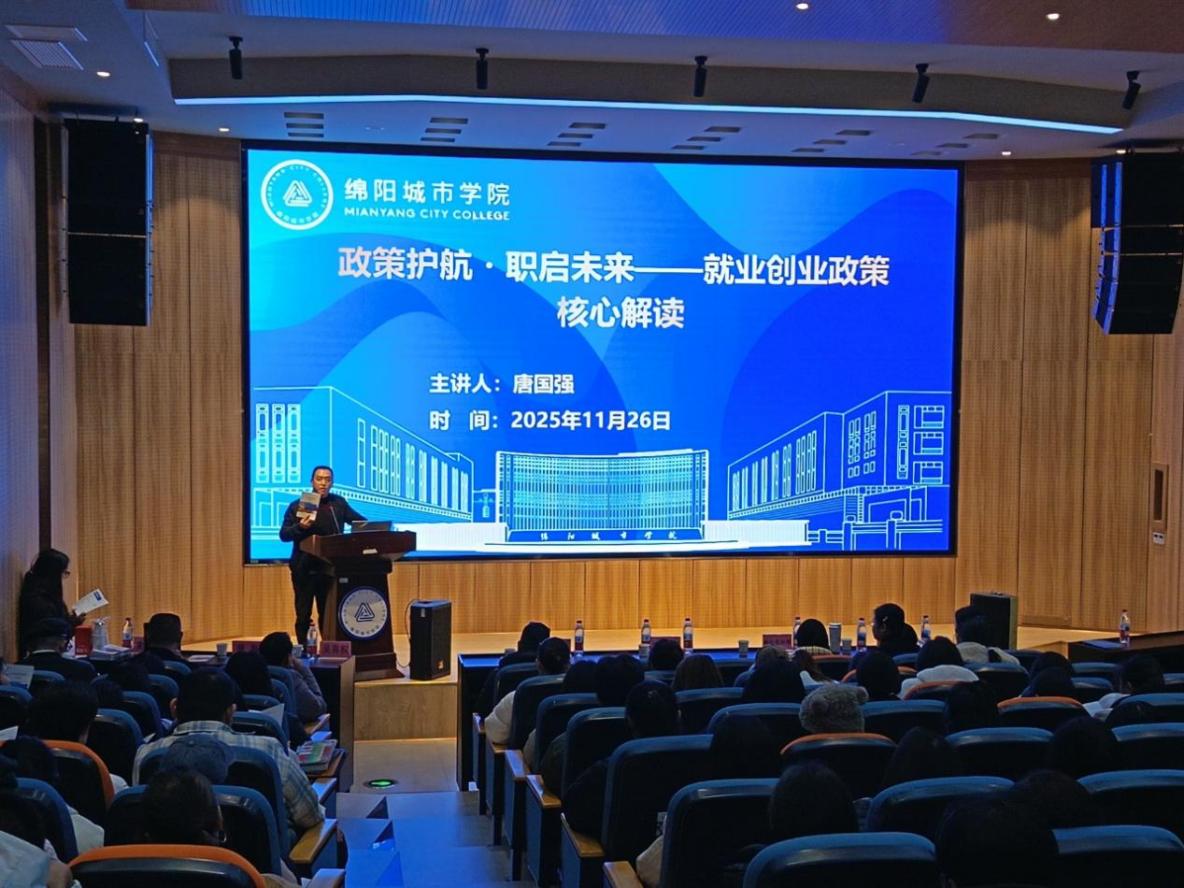 11月26日,由绵阳市人社局指导,游仙区人社局、游仙区妇联主办,yl23455永利集团承办的“政策护航·职启未来”老员工就业创业政策宣讲会在yl23455永利集团游仙校区守正书院会堂举行。公司党委书记王宇昊教授、党委副书记、学工办主任林海等领导及150名同学参加会议。宣讲会由工商管理教研室主任吴有权老师主持。